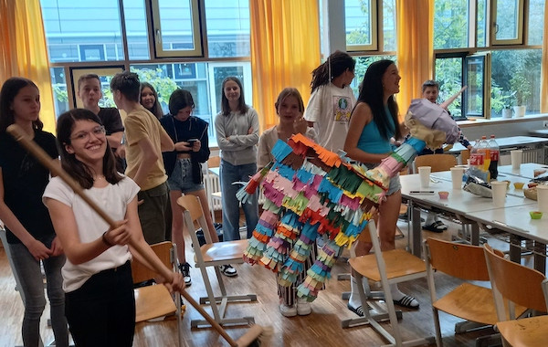 Im Spanischunterricht der 3A, 3B und 3C wurde eine mexikanische Geburtstagstradition gefeiert – das Zerschlagen der Piñata. Die Piñata ist eine bunte Figur aus Papier, die mit Süßigkeiten gefüllt und an einem Seil aufgehängt wird. Mit verbundenen Augen wird sie schließlich so lange geschlagen, bis die Süßigkeiten auf den Boden fallen. Die Schüler:innen waren mit Begeisterung dabei und haben tolle Piñatas gebastelt!